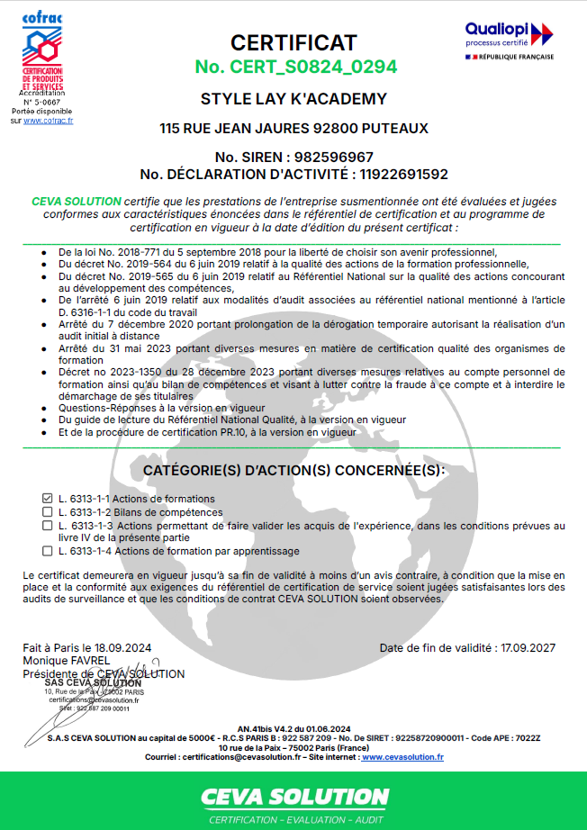 Nom de l’organisme de formation : STYLE LAY K’ACADEMY